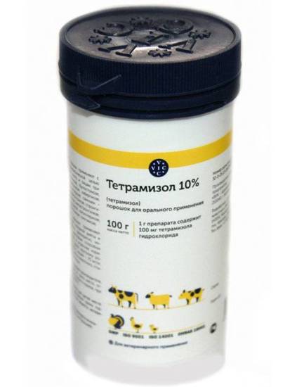 Тетрамизол 10% выпускают в виде желтого гранулята и белого порошка, растворимого в воде. Его действующее вещество состоит из 2-х изомеров, в активной и неактивной форме. Средство воздействует против нематод, червей, которые паразитируют в легких, желудке и кишечнике животного.