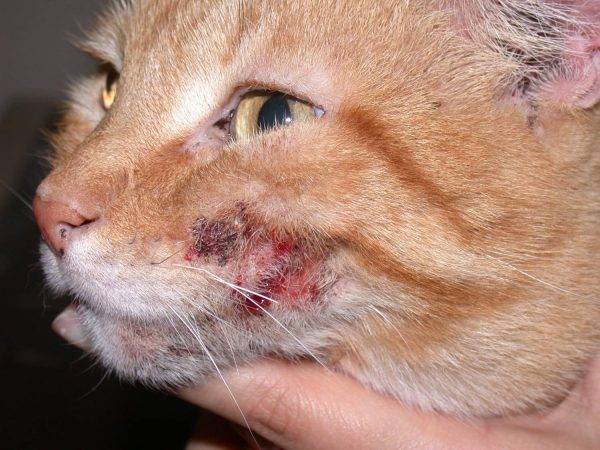Аллергия провоцирует появление зудящих участков на коже, что вынуждается кошку расчёсывать до крови больные участки