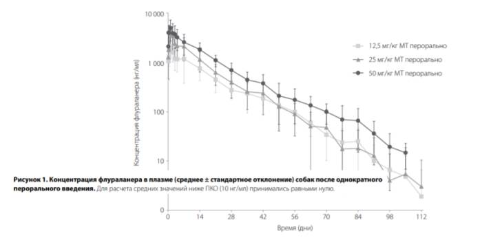 На рисунках представлена концентрация действующего вещества (флураланера) в плазме после однократного перорального введения (рис. 1) или внутривенного введения (рис. 2)