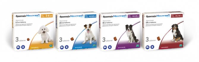 Фронтлайн Нексгард содержит в своем составе афоксоланер, который обеспечивает защиту животному от гельминтов и эктопаразитов в течение 30 дней. Жевательные таблетки имеют вкус говядины, поэтому собаки обычно с удовольствием их принимают. Одна упаковка содержит от 3 до 6 жевательных пилюль. Цена трех таблеток варьируется от 1000 до 2000 рублей.