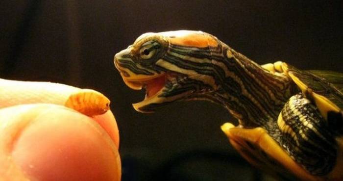 Важно! Если молодая особь отказывается от пищи либо съедает с неохотой, следует уменьшить количество корма. Красноухую черепаху, возраст которой превышает один год, нужно кормить 2-3 раза в неделю