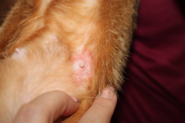 Первое, что нужно делать – это аккуратно самому обследовать сосок. Чтобы понять характер заболевания, есть ли опухоль под соском и увидеть реакцию кота.