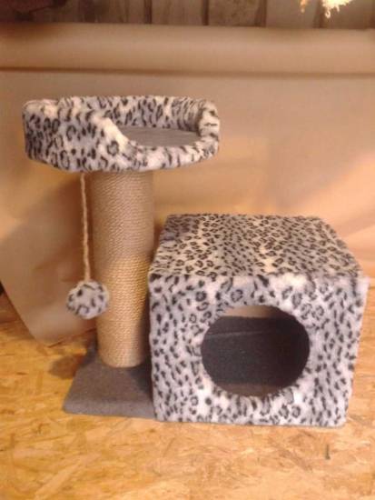 В продаже представлен широкий ряд кошачьих лежанок в виде укромных домов. За основу таких изделий выбирают тонкую фанеру, которую в дальнейшем обвивают мягким ковровым покрытием.
