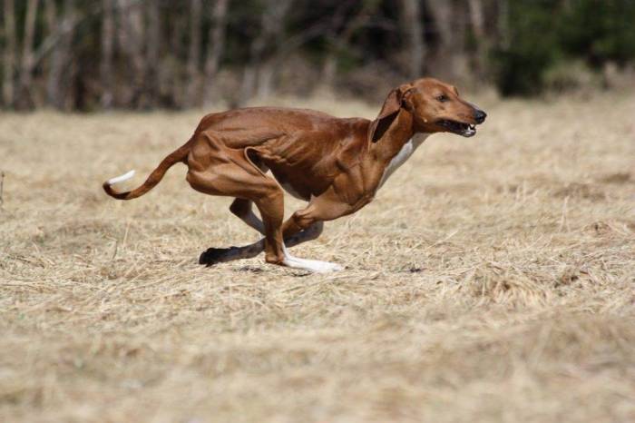 Данная собака – высокая в холке, может выглядеть как элегантно-поджарая. Она выведена для безружейной охоты на мелкую дичь и участия в собачьих бегах на большие дистанции.