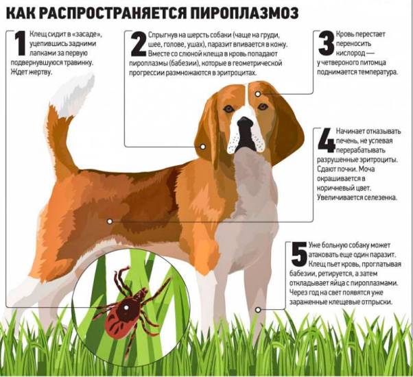 Одноклеточные простейшие пироплазмы (Piroplasma canis) разрушают эритроциты. В анализе крови видно резкое снижение числа эритроцитов. В организме накапливаются ядовитые продукты распада гемоглобина, что нарушает функционирование внутренних органов. Сколько дней болеет собака после укуса? Ответ на этот вопрос зависит от исходного состояния животного, но обычно инкубационный период 4 – 15 дней. Длительность его зависит от числа паразитов в крови, времени кровососания и иммунитета жертвы. При своевременном обнаружении пироплазмоз хорошо поддается лечению, но требуется длительная реабилитация.