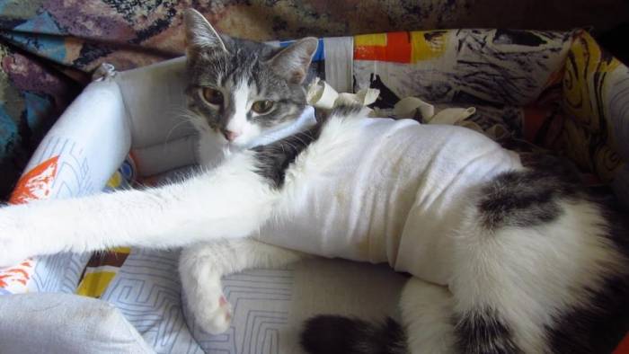 - Как правило, около двух недель кошке нужно будет носить утягивающий корсет или тугую попонку (или хирургический воротник).