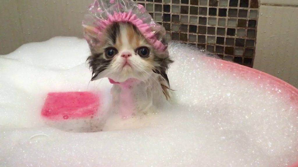 Погружая котенка в воду, следует проследить чтобы она не подымалась выше линии плеч. Оптимальная температура — от 36 до 39оС. Необходимо крепко держать малыша, чтобы не дать ему возможности выскочить. Во время этого мероприятия желательно постоянно разговаривать с питомцем и отвлекать его резиновыми мячики, мыльными пузырями и прочими подручными средствами.