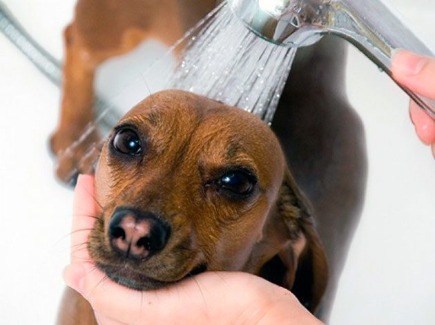 Начинают аккуратно мочить шерсть любимца. Не рекомендуется лить воду сверху на пса, а также в паховую область.