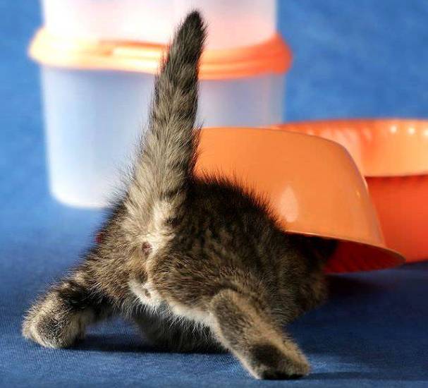 Маленьких непоседливых котят поворачивают головкой к себе, зажимают тельце между коленями в районе спины. Малыша следует фиксировать крепко, но, главное, сильно не давить на горло. Помимо наконечника клизмы (меньшего диаметра, чем для взрослых животных), обильно смазывается и анальное отверстие котика. Для котят достаточной глубиной введения будет 1-2 см, поскольку длина кишечника у них небольшая.