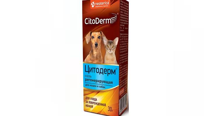 Цитодерм. Еще один представитель отечественного производства от компании Экопром. Данное средство сделано на основе Д-пантенола и полиэтиленгликоля. Также есть вспомогательные компоненты. Сочетание компонентов позволяет добиваться хороших результатов в регенерации кожи после обморожений, ожогов, ссадин, царапин и порезов. Цитодерм часто также назначают при растрескиваниях кожи, которые встречаются в области молочных желез и подушечек лап. Перед нанесением мази на рану рекомендуется предварительно обработать ее раствором антисептика. Это позволит убрать корочки и застывшую кровь. Если очаг поражения находится в труднодоступном месте, то рекомендуется выстричь в этом месте шерсть, чтобы был доступ для обработки. Средство наносят тонким слоем на проблемное место 2-3 раза в день в течение 7-10 дней. Из противопоказаний производитель настоятельно рекомендует ограничить питомцу доступ к слизыванию препарата после обработки. Для этого используется специальный медицинский колпак или рана закрывается с помощью повязки.