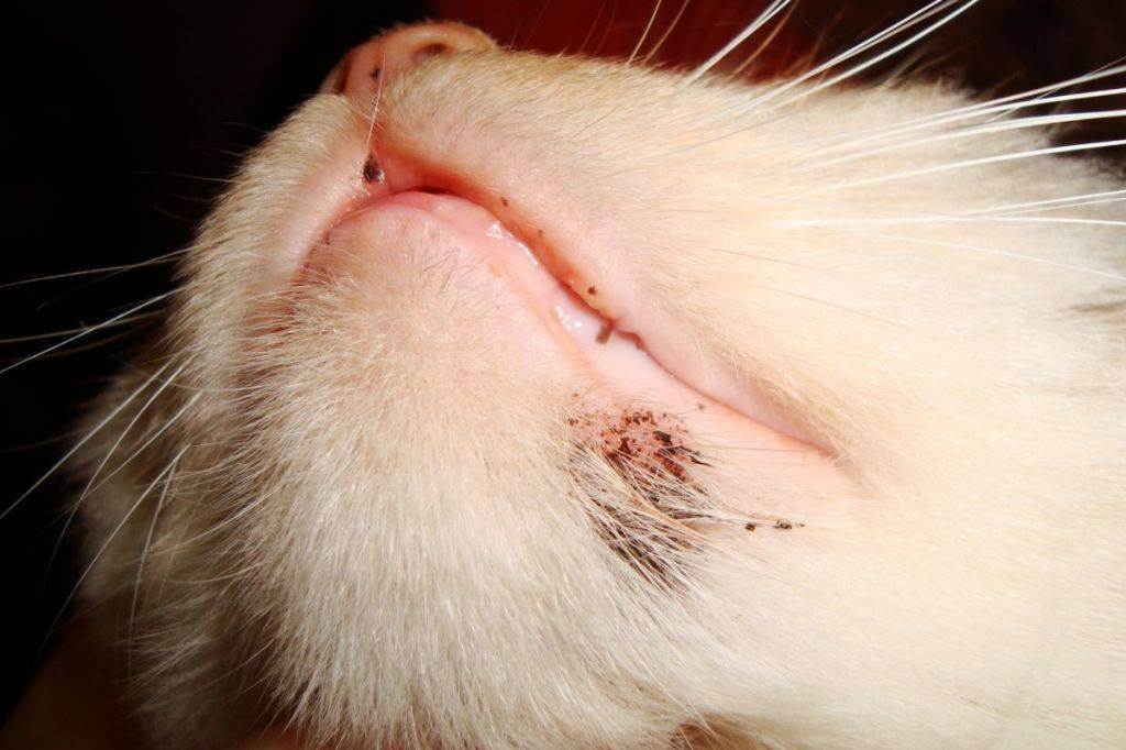 Чёрные точки вдруг могут появиться на мордочке кошки в области губ. Мордочка кажется словно сухой. Постепенно высыпания превращаются в гнойнички. Они вскоре лопнут, а на их месте станет заметна короста. Следующий симптом — выпадение шерсти с образованием на этом месте сухой воспалённой кожи.