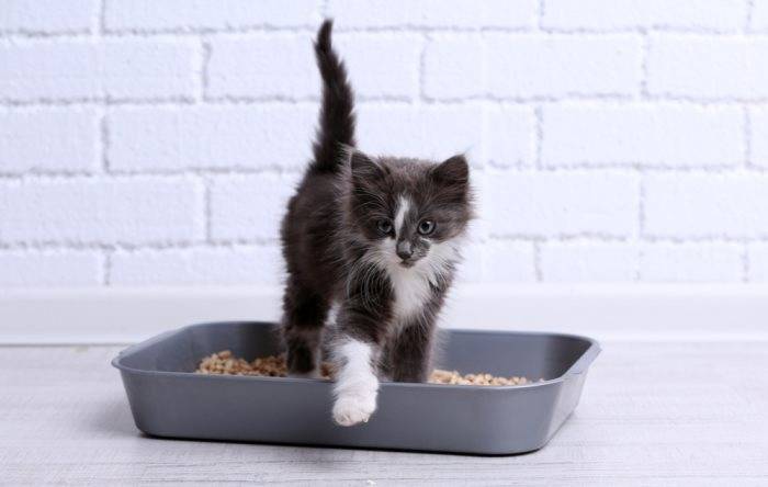 При подозрении, что котенок хочет в туалет, нужно отнести его в лоток.