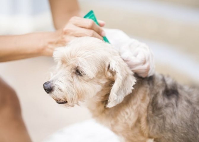 Собакам крупных пород во избежание стекания инсектицида и слизывания последнего препарат следует наносить линией в 2–4 точках в области позвоночника.