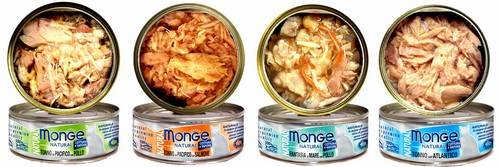 - Филе тунца. В корме Monge показатель содержания тунца достигает 45%, что не может не повлиять положительно на качество и вкус корма.