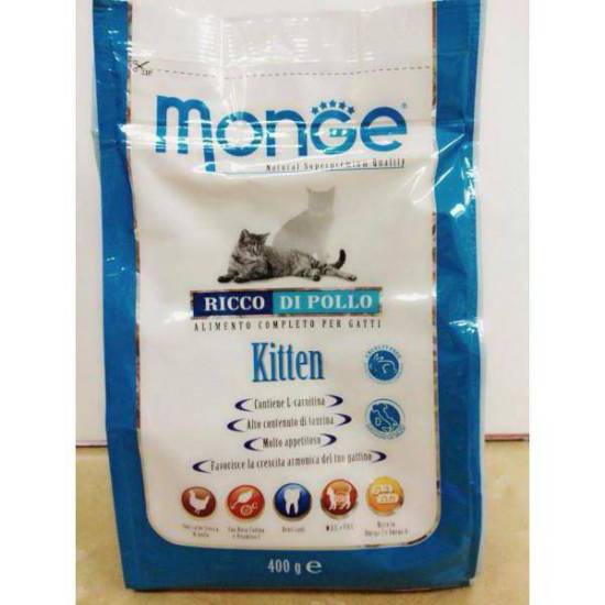 - Сухой корм Monge Kitten для котят, беременных и кормящих самок. Стоимость упаковок весом 0,4; 1,5; 1 кг составляет 289; 946 и 4240 руб.