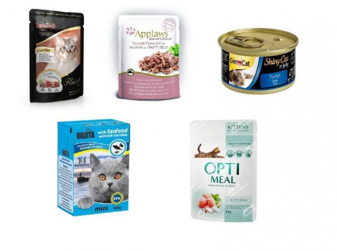 - Влажные корма и консервы. Это обволоченные в соусе, мясные кусочки, представленные в виде герметичных порционных пакетов или консервов. Отличается ярко выраженным мясным вкусом.