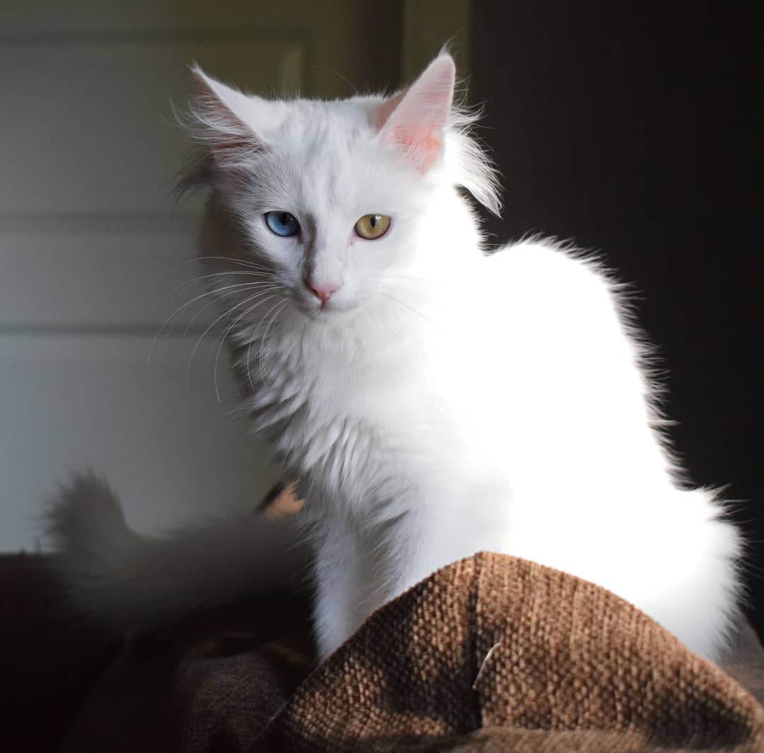 Он также имеет разный цвет глаз. Зачастую один глаз голубой, а второй жёлтый или оранжевый. Таких питомцев по праву можно назвать пушистыми, ведь их шерсть мягкая, шелковистая, хотя и недлинная. Турецкие коты достаточно умные и их легко можно научить некоторым приёмам из дрессировки.