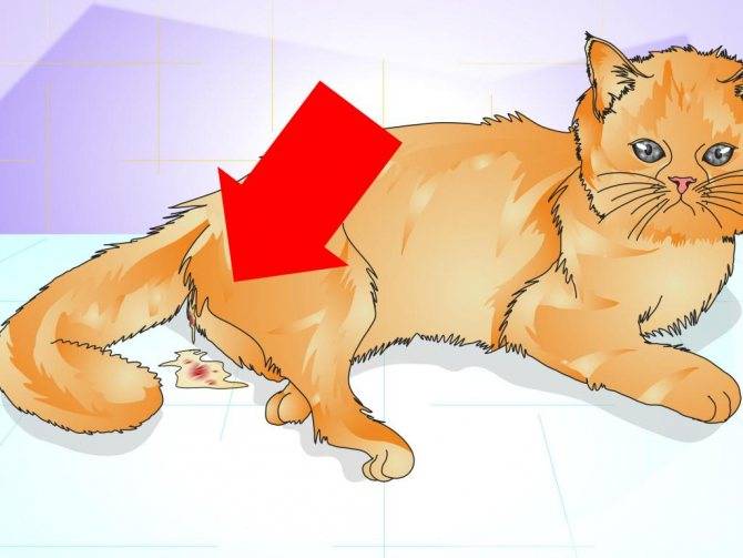 Выделения из петли. Они могут быть кровянистыми или мутно – белыми, зловонными. Кошка может оставлять пятна на подстилке, выделения могут капать