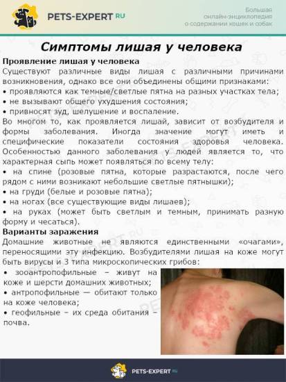 Как упоминалось выше, некоторые виды лишая действительно могут передавать человеку и другим животным. Заразиться можно как при личном контакте с животным, так и через предметы, находящиеся в помещении с заражённым животным и контактировавшие с ним (например, игрушки, мебель, ковровые покрытия).