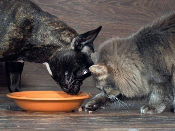 Если животные разных видов живут в одном доме, кормушки для котов надо ставить на возвышения, куда «соседи» не смогут добраться. За кошками придется следить, чтобы они не ели из собачьих мисок.