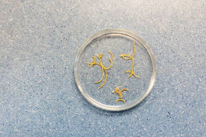- Круглые черви – небольшие «толстенькие» черви с округлым телом, обычно белого цвета, длиной 5 см или меньше. Этим видно паразитов проще всего заразиться, а самый распространенные его представители – это аскариды.