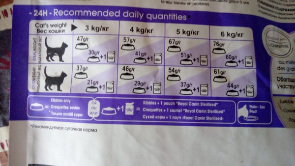 На упаковках корма всегда указывается рекомендуемая дозировка данной продукции в зависимости от веса животного