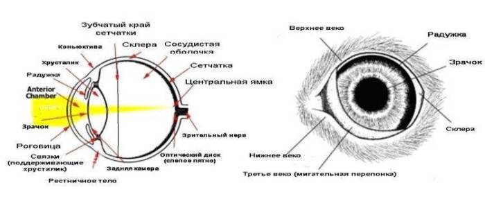 Кошачий глаз состоит из 3 оболочек, каждая из которых выполняет уникальные функции по обнаружению и восприятию света – видимой части электромагнитного излучения. Общая схема строения представлена на фото.