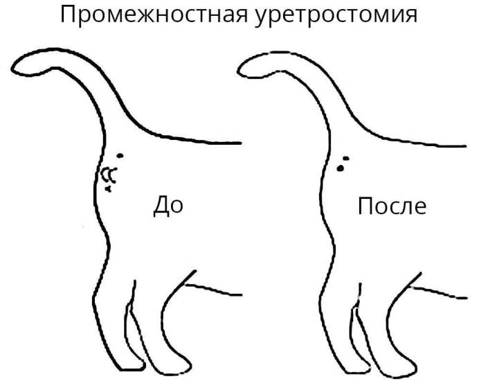 Уретростомия призвана устранить подобные нарушения. В ходе операции у животного формируется новое отверстие для мочеиспускания (стома). Его делают между брюшиной и широкой частью уретры. Созданное хирургическим путем уретральное отверстие прямое, широкое и короткое. Таких размеров достаточно для свободного прохождения песка и мелких камней.