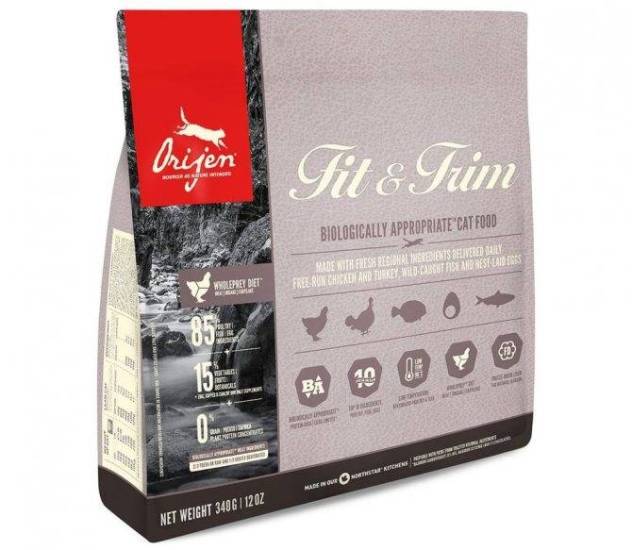 - Fit & Trim. Состав: 85% — свежее мясо индейки, цыпленка, дикая сельдь, камбала, серебристый хек и куриные яйца. В корм включено еще 15% овощных и фруктовых ингредиентов. Предназначен для кошек, имеющих лишний вес. Калорийность — 371 ккал на 100 г.