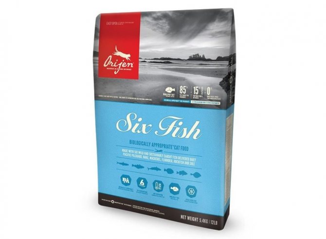 Еще один продукт, подходящий для повседневного кормления – Orijen Six Fish. Это сбалансированный корм на основе свежей рыбы. Основные компоненты таковы (в %):