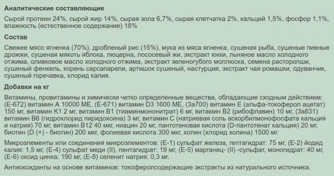 Свежее мясо ягненка (70%) — хороший источник белка. Конечно, после готовки его объем уменьшился минимум втрое, но далее по составу еще есть мука из мяса ягненка и сушенная рыба. При этом богатых растительным белком ингредиентов нет, поэтому можно делать выводы, что основная часть из указанны в анализе 24% протеина — животного происхождения.