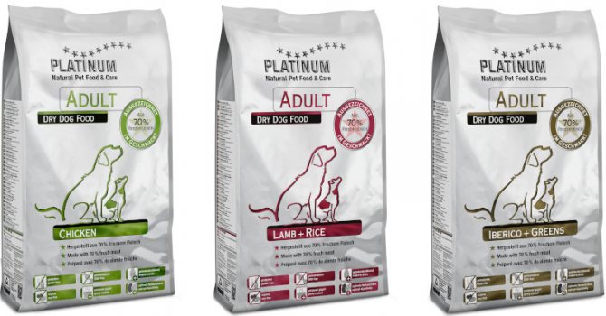 Линейка «Платинум» представлена различными кормами, большая часть которых предназначена для питания взрослой собаки. Главной особенностью любой разновидности этой линейки является то, что в составе имеется 70% и более свежего мяса. Причем технология производства позволяет сохранить в гранулах мясной сок, который придает корму влажность и приятный вкус. Благодаря особой технологии в продукцию на стадии изготовления не вносится вода.