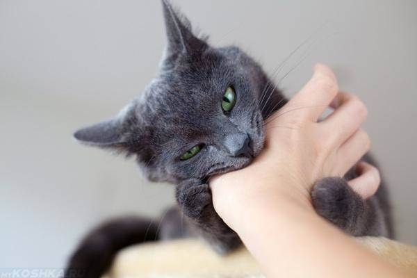 - если кошка вцепилась в руку, не стоит резко ее вырывать. В такой ситуации она разозлится еще больше и будет только усиливать свою агрессию. Следует замереть на некоторое время, подождать пока питомец отпустит руку, а после перестать играть. Таким способом кошка поймет, что агрессивное поведение — это повод для окончания игры и общения с хозяином;