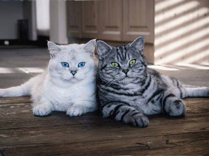 - Британцы. Порода кошек, которая бывает однотонной либо с разными полосами. Зачастую особи имеют дымчатый цвет, а также бывают с тигровым рисунком, пятнами и мраморные.
