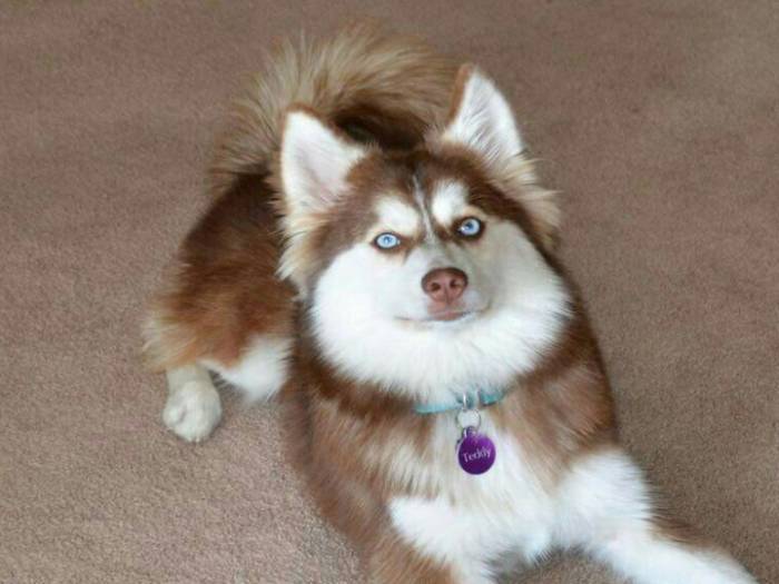 • окрас хаски, часто от этой породы достаются и голубые глаза.