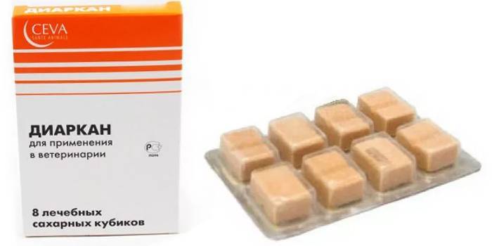 Препарат оказывает антимикробное действие, эффективен против сальмонеллы, шигеллы и кишечной палочки. Представляет собой сахарный кубик, который необходимо давать животному дважды в сутки не менее 5 дней. Диаркан противопоказан собакам весом до 1 кг, при нарушениях работы почек и печени, мочекаменной болезни, беременности. При передозировке препарата симптомы диареи могут усилиться и к ним присоединится рвота. Цена – от 522 руб.