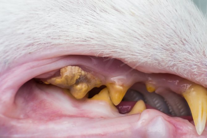 распространение зубного камня по всей челюсти кота, которое рано или поздно поведет за собой расшатывание и выпадение зубов;