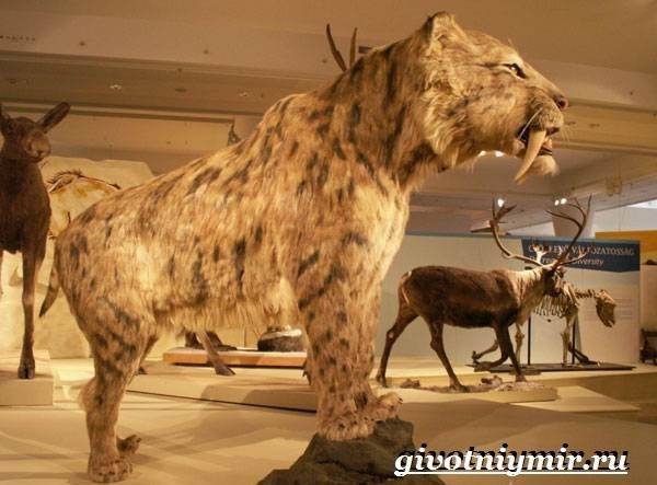 Смилодоны или саблезубые тигры жили на территории Америки и были очень крупными представителями подсемейства. Их вес составлял от 150 до 400 кг, то есть побольше, чем у многих современных тигров. А вот хвост у них не был похож тигриный. Он был коротким и скорее напоминал хвост рыси. Основная особенность смилодонов – пасть с клыками длиной до 30 см.