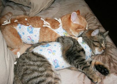После проведенного оперативного вмешательства, на животное надевают специальный бандаж (попону), позволяющую уберечь раневую поверхность от инфекций и ускорить процесс заживления швов.