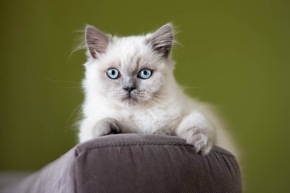 - Колор-пойнт похож на сиамский окрас, когда шерсть по телу светлая, а морда, уши, лапки и хвостик темные, коричневые или черные. У таких кошек голубые глаза.