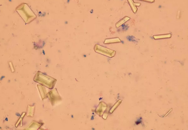 Трипельфосфаты обнаруживают при кристаллографическом анализе мочи. Кристаллы по форме напоминают крышку гроба. Часто их находят случайно, до появления признаков мочекаменной болезни.