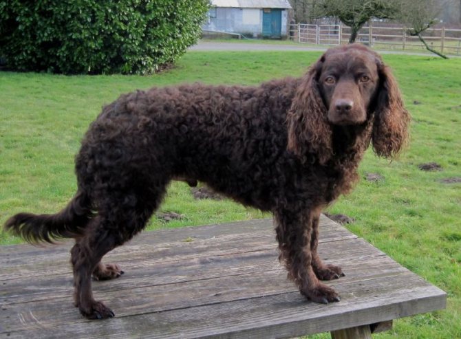 Ирландский водяной спаниель. Вынослива, адаптируется к погодным условиям. Обладает густой, водоотталкивающей шерстью. Отличительный признак – голый хвост. Он похож на крысиный. Сама собака покрыта плотной, курчавой шерстью.