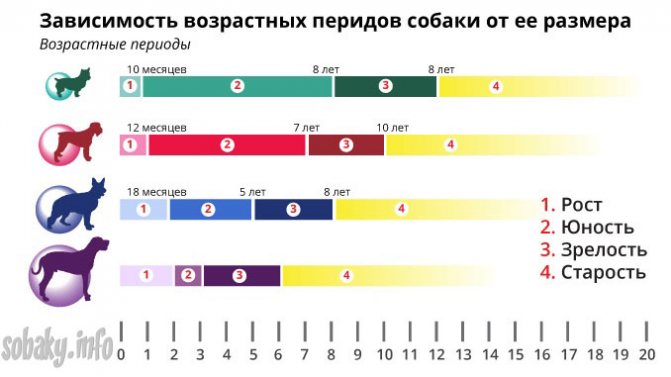 Хозяину нужно быть особенно внимательным, когда собака вступает в пору зрелости. Временные ранки прихода старости индивидуальны для каждого животного. Процесс дряхления у псов-гигантов начинается приблизительно с 5-6-летнего возраста (55 человеческих лет), 8-9-летнего у средних собак (63 года) и 10-летнего у маленьких пород (55-60 лет). Пожилая собака требует особого ухода и внимания. Часто старички страдают повышенной раздражительностью и ранимостью. Подробнее об особенностях содержания пожилых собак вы можете прочитать .