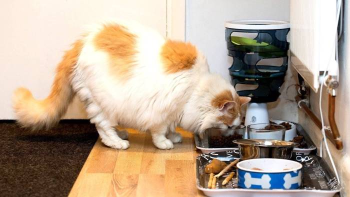 - Если вздутие было вызвано перееданием или жадным глотанием кошкой воздуха во время еды, можно предварительно заливать сухой корм теплой водичкой. Также рекомендуется предоставить питомцу постоянный доступ к корму (при этом на день в миску насыпают строго суточную норму).