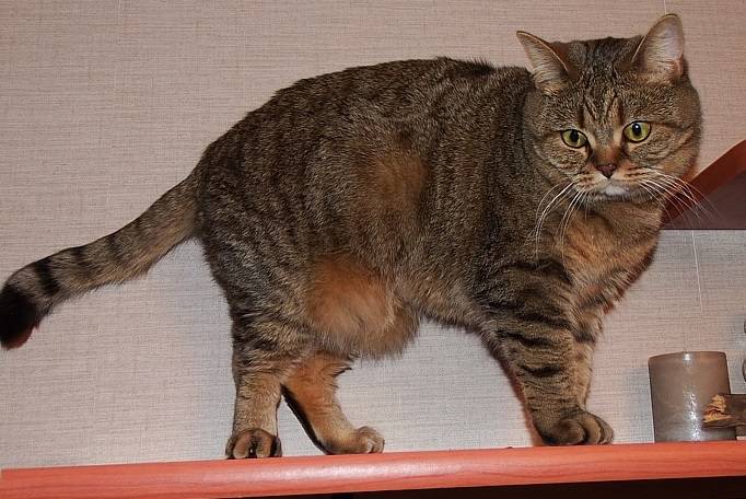 - живот приобретает форму груши, когда кот встает на задние лапы, и надувается и округляется при принятии положения сидя;